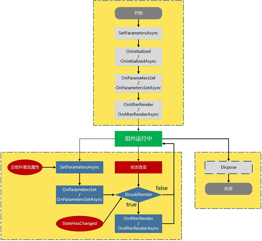 Blazor的生命周期与React组件的生命周期类似,也分为三个阶段:初始化阶段、运行中阶段和销毁阶段,其相关方法有10个,包括设置参数前、初始化、设置参数之后、组件渲染后以及组件的销毁,但是这些方法有些是重复的,只不过是同步与异步的区别。