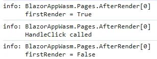 }加载页面并选择按钮时,AfterRender.razor 示例向控制台输出以下内容: