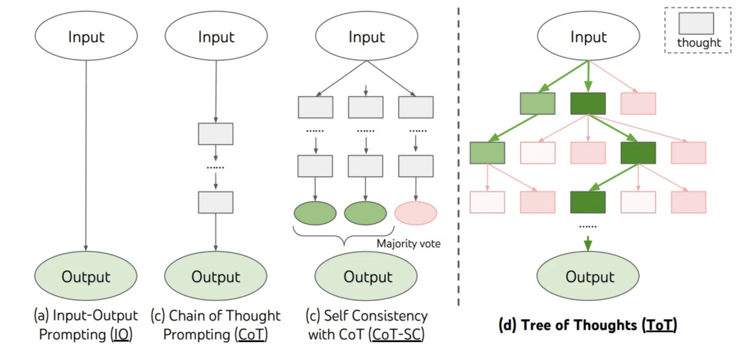 ToT不再遵循单一链条,而是使模型能够同时探索多个不同的推理路径,创建一个树状结构,其中每个节点代表一个部分解决方案或 “思想”。在问题解决过程的每一步,模型都会生成几个潜在的下一步(分支)。然后,它使用自我评估机制或基于启发式的投票来评估每个分支的前景。这使得智能体能够“向前看”,修剪没有希望的路径,从死胡同中回溯,并将更多资源投入到最可行的路线上。