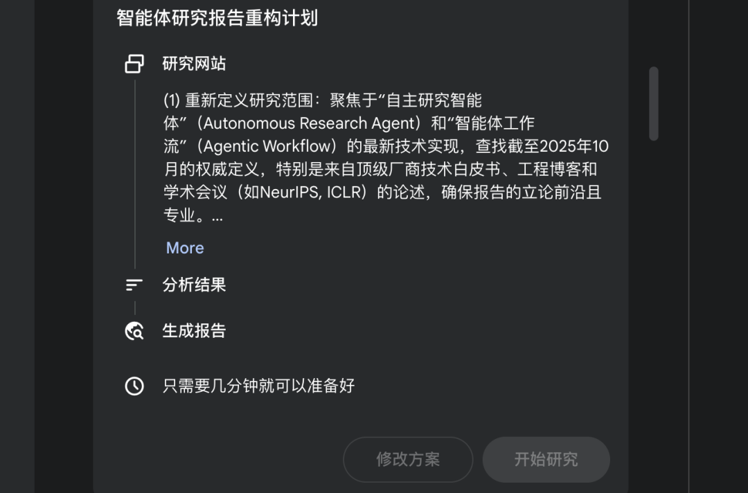 像谷歌的 Deep Research 在执行任务之前,就会将规划的执行步骤公开出来,在执行开始前将生成的 “多点研究计划” 呈现给用户进行审查和完善。这给予了用户一定程度的控制,并确保智能体的策略与他们的目标保持一致。