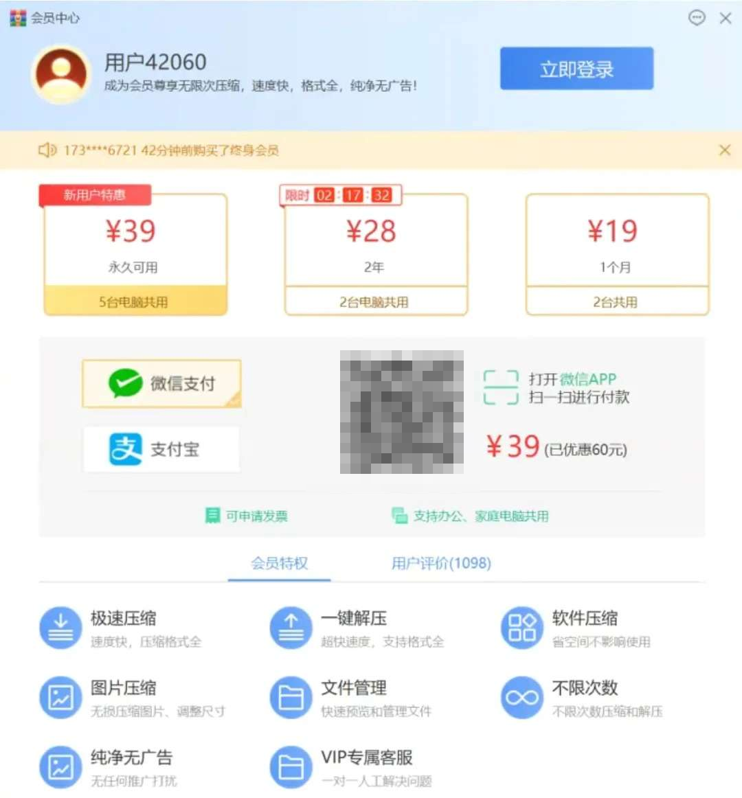 但电脑小白去浏览器搜索解压软件的时候, 往往会遇到一些套壳的流氓软件, 有些一安装就自动捆绑“全家桶”, 有些强制收费才能下载的软件, 更有甚者,刚解压几个文件就弹出付费窗口,不开通月付会员就不让继续使用。