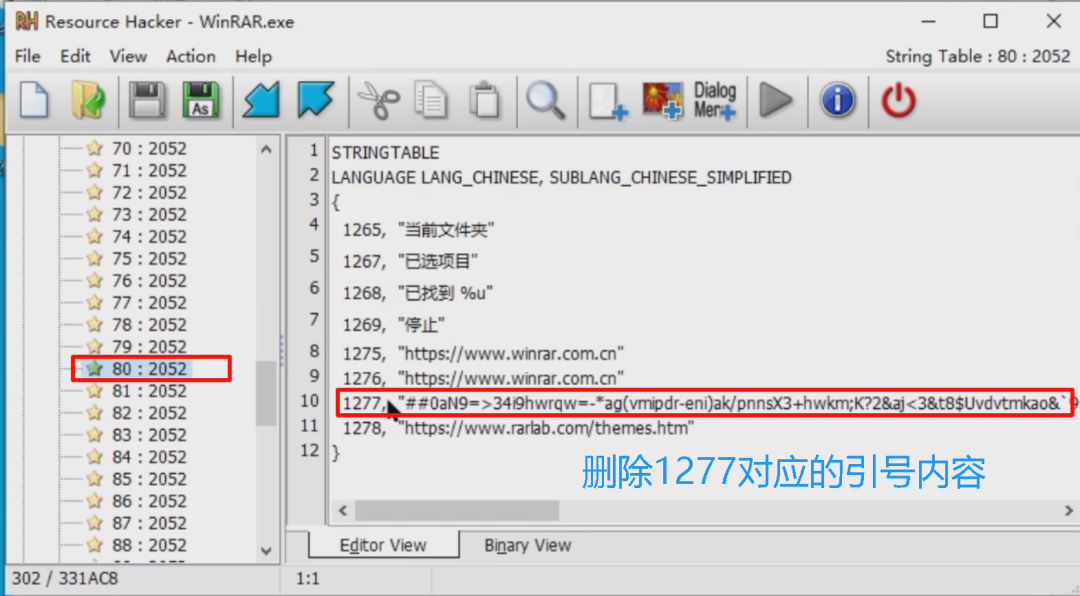 5.锁定"StringTable", "80 : 2052", 删除1277对应引号的内容
