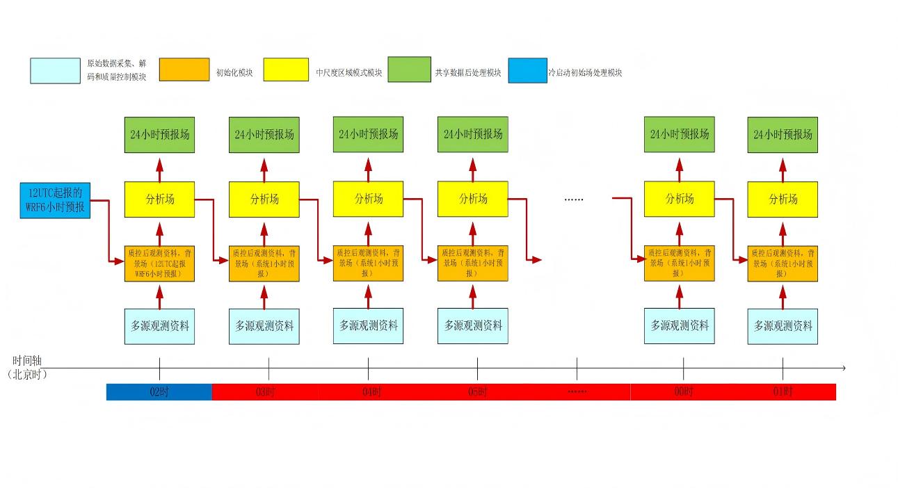 快速循环同化预报所提供的2-12h预报已成为航空气象、强对流灾害天气等主要的中尺度预报指导产品。预报系统由同化和预报两个部分构成,通过高频次的资料,同化吸收最新的观测信息,不断更新模式背景场,形成更准确的初始场并进行短时预报。此外,结合AI技术可以对模式预报数据进行订正优化。