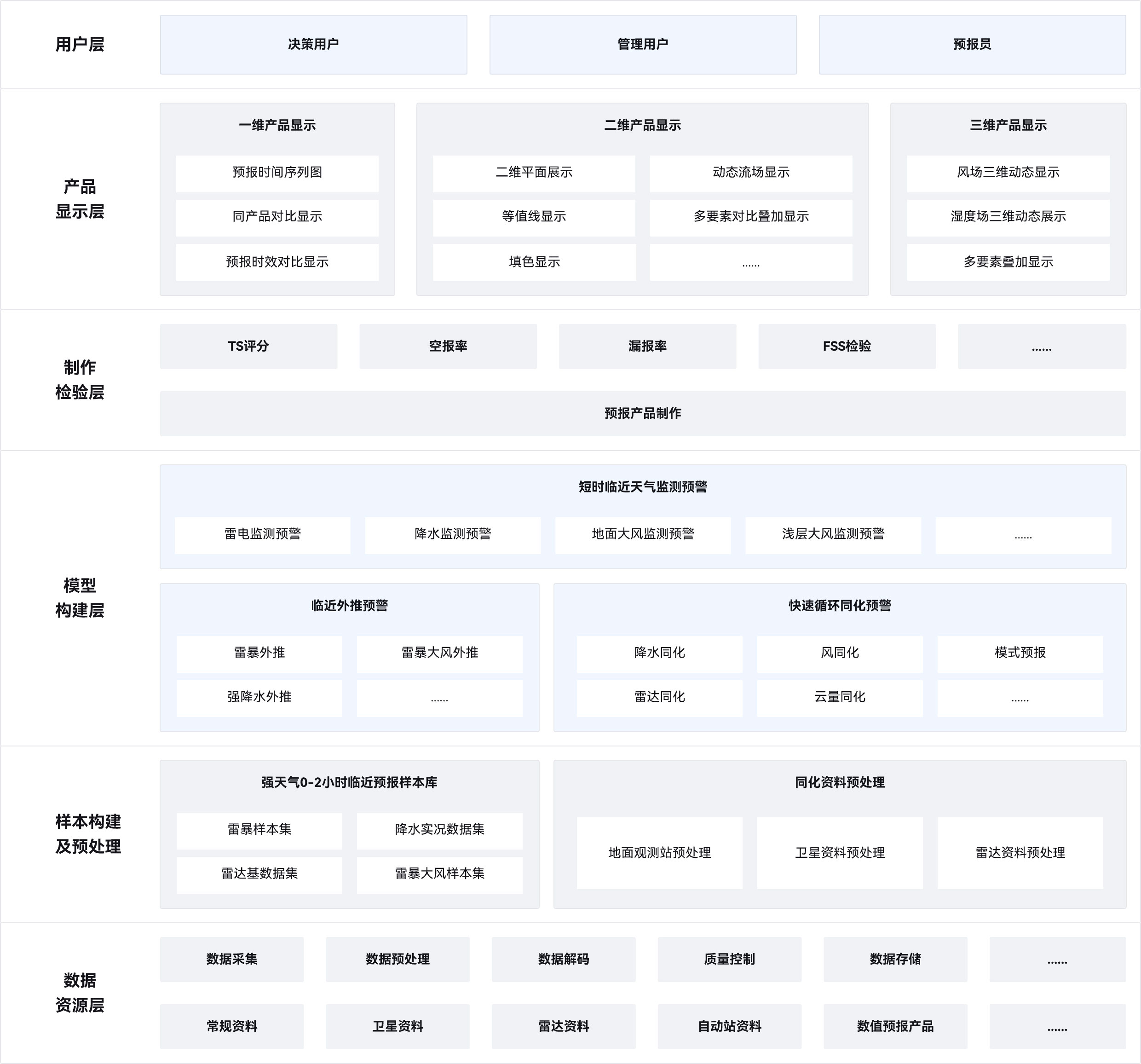 短时临近预报依托高时空分辨率的中小尺度观测网络获取高频、密集的数据。由雷达、卫星、自动站等设备捕捉到的实况数据,首先经过数据资源层的筛选、分析,整合成标准的数据集,及时分散气象资料数据量大、突发性强的压力。