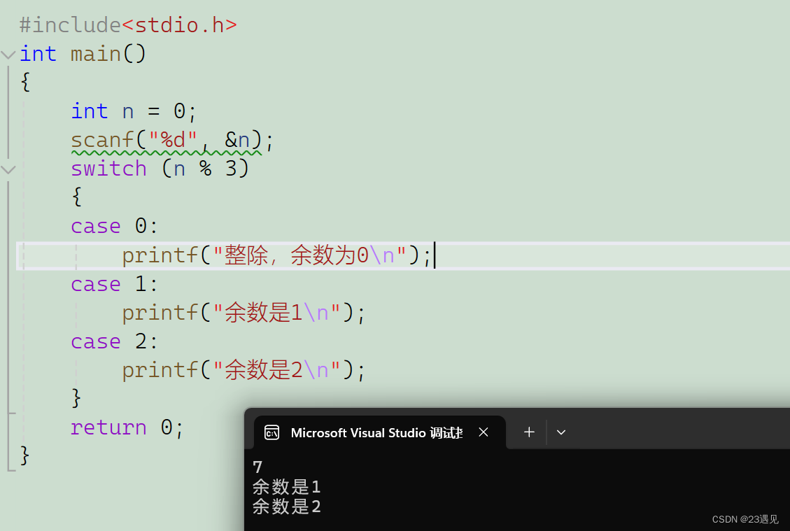 运行结果多了一行“余数是2”的打印。原因是switch语句也是分支效果的,只有在switch语句中使用break才能跳出switch语句,如果某一个case语句后面没有break语句,代码就会继续执行下去,有可能执行到其它case语句中,直到遇到break语句或者switch语句结束。所以在switch语句中break语句是非常重要的,能实现真正的分支效果。当然,break也不是每个case语句都必须有,这要根据实际情况来看了。例如: