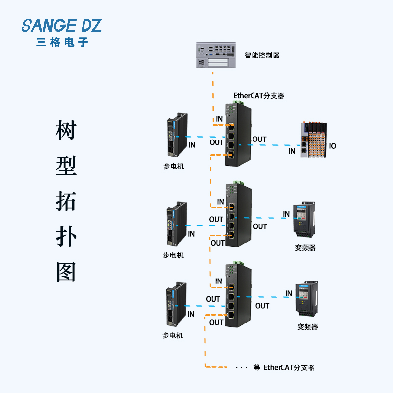 星形拓扑下,智能控制器作为中心节点,借助分支器连接多个步进电机、变频器、伺服等设备,形成辐射状结构,实现对设备的集中管理和精准控制。