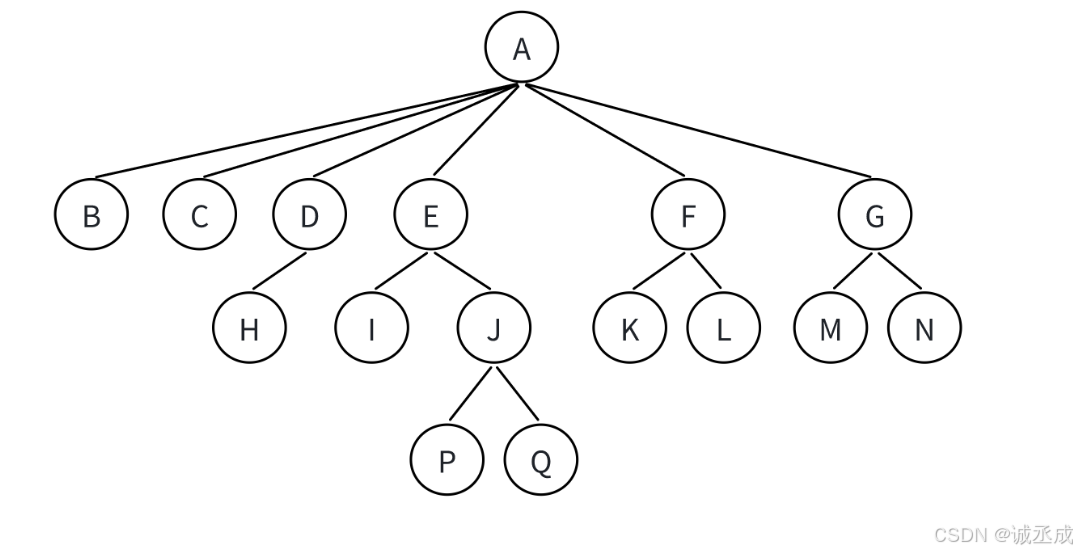 子孙:以某节点为根的子树中任一节点都称为该节点的子孙。如上图:所有节点都是A的子孙