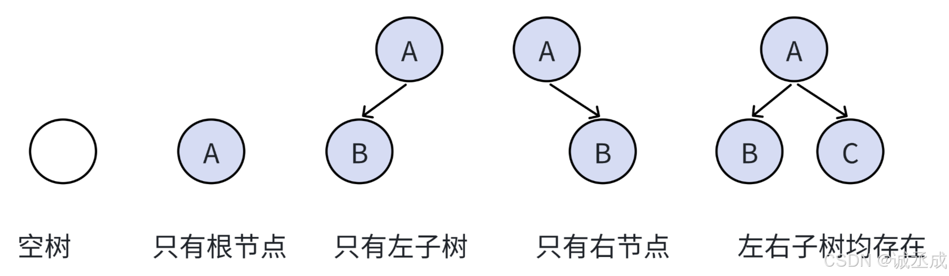 注意:关于第四点性质,在此处简单讲解一下: 二叉树是由一个个度为0的节点依次连接而成的,假设此时有1个度为0的节点A并插入一个节点B,此时A节点的度变为1,B节点的度依然还是0,度为0的节点数还是1个,度为1的节点数由0变成1个,而度为2的节点是由度为1的节点演化而来,当增加一个度为2的节点时,度为0的节点也会增加一个,类推即可得性质4.