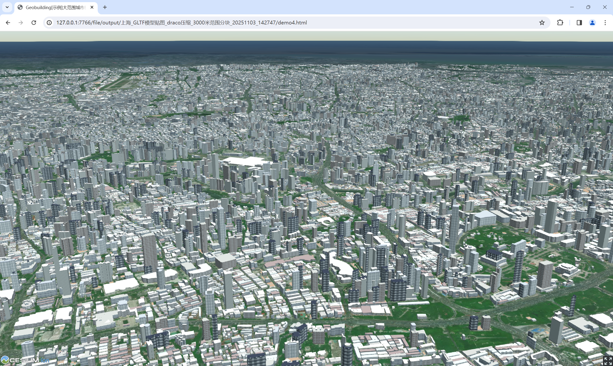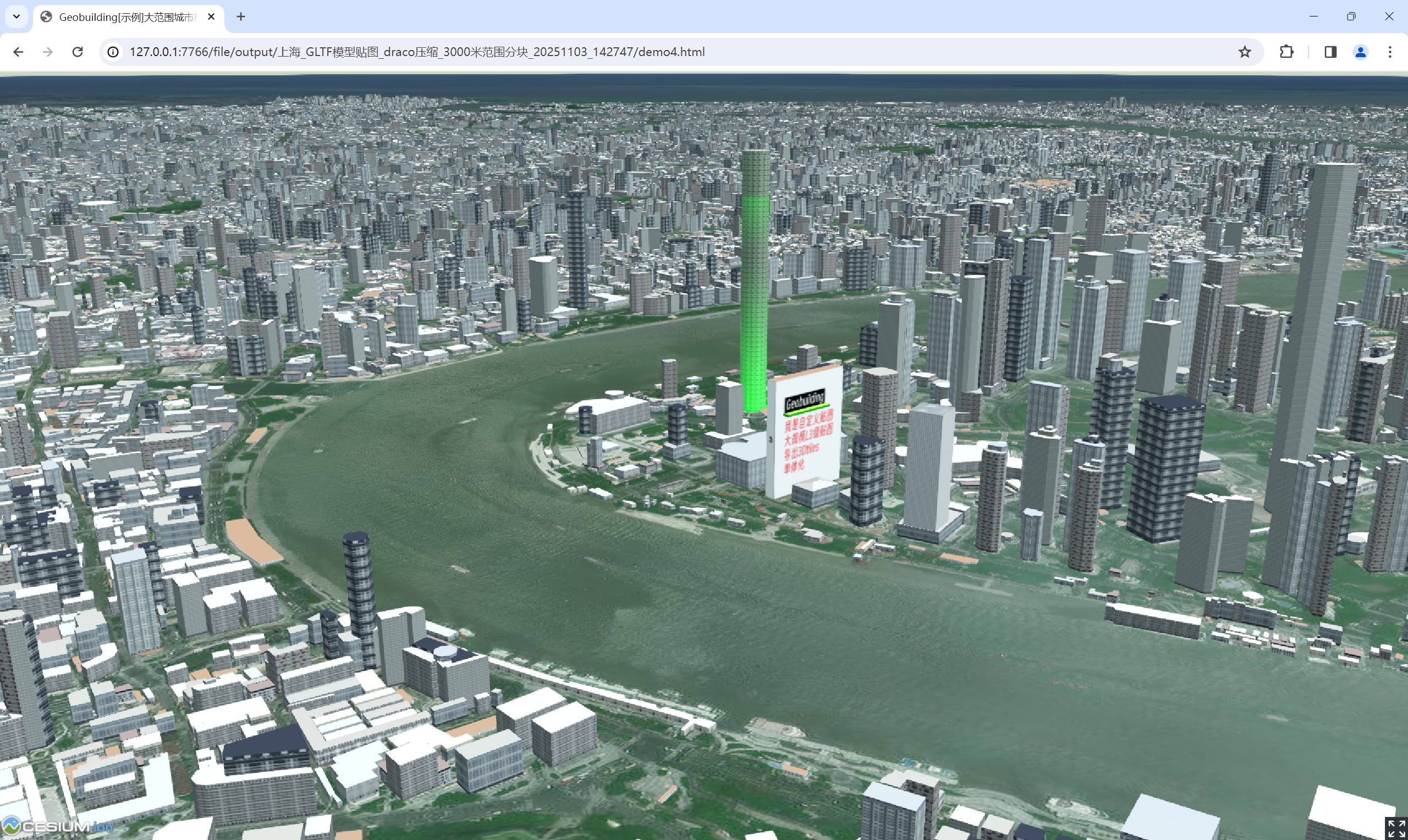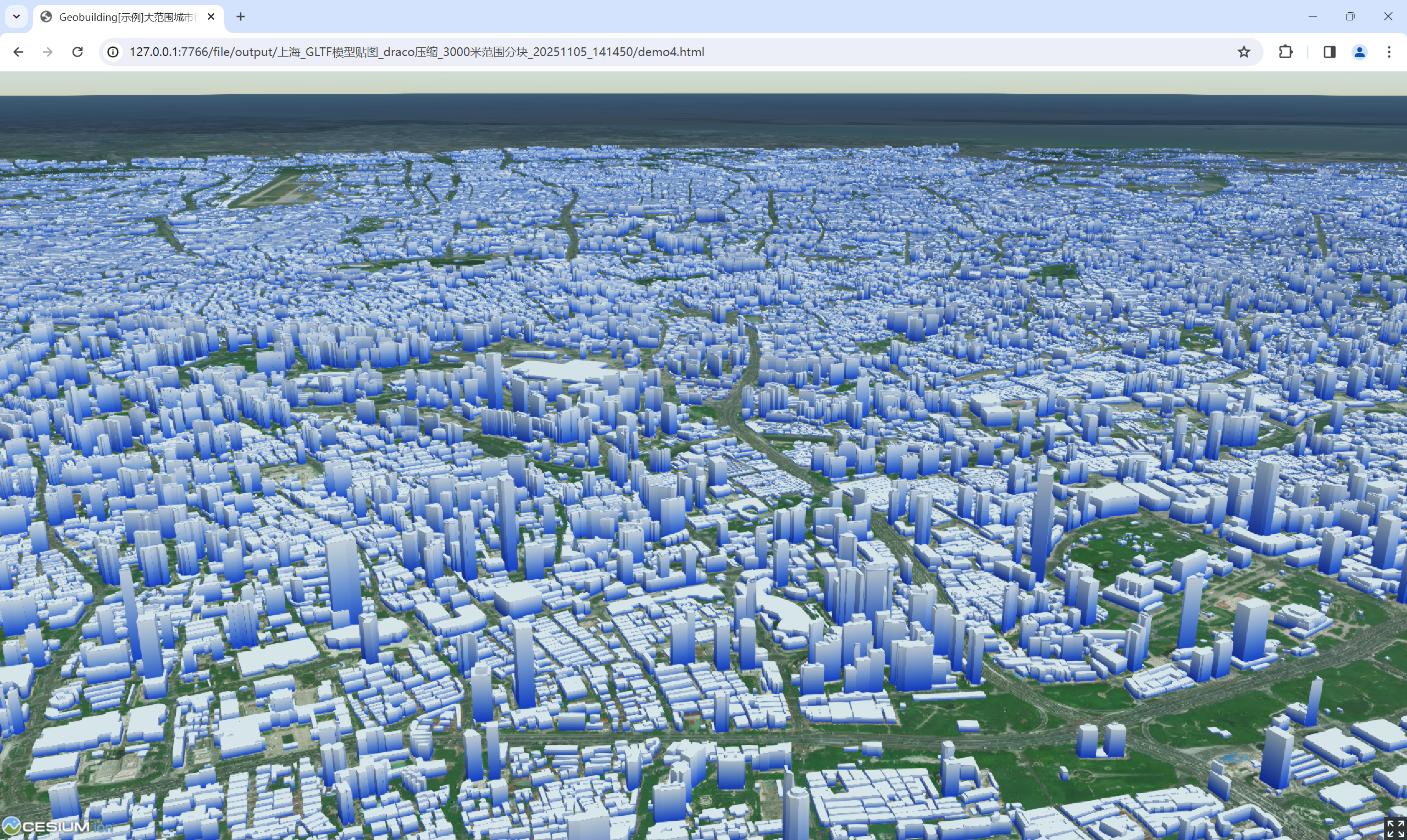 对于大规模城市场景,在cesium端流行的方法是,使用工具将GIS数据shp建筑白模或geojson白模直接转换成3dtiles格式。然后使用着色器代码对白模贴图,常见的就是渐变色贴图效果。