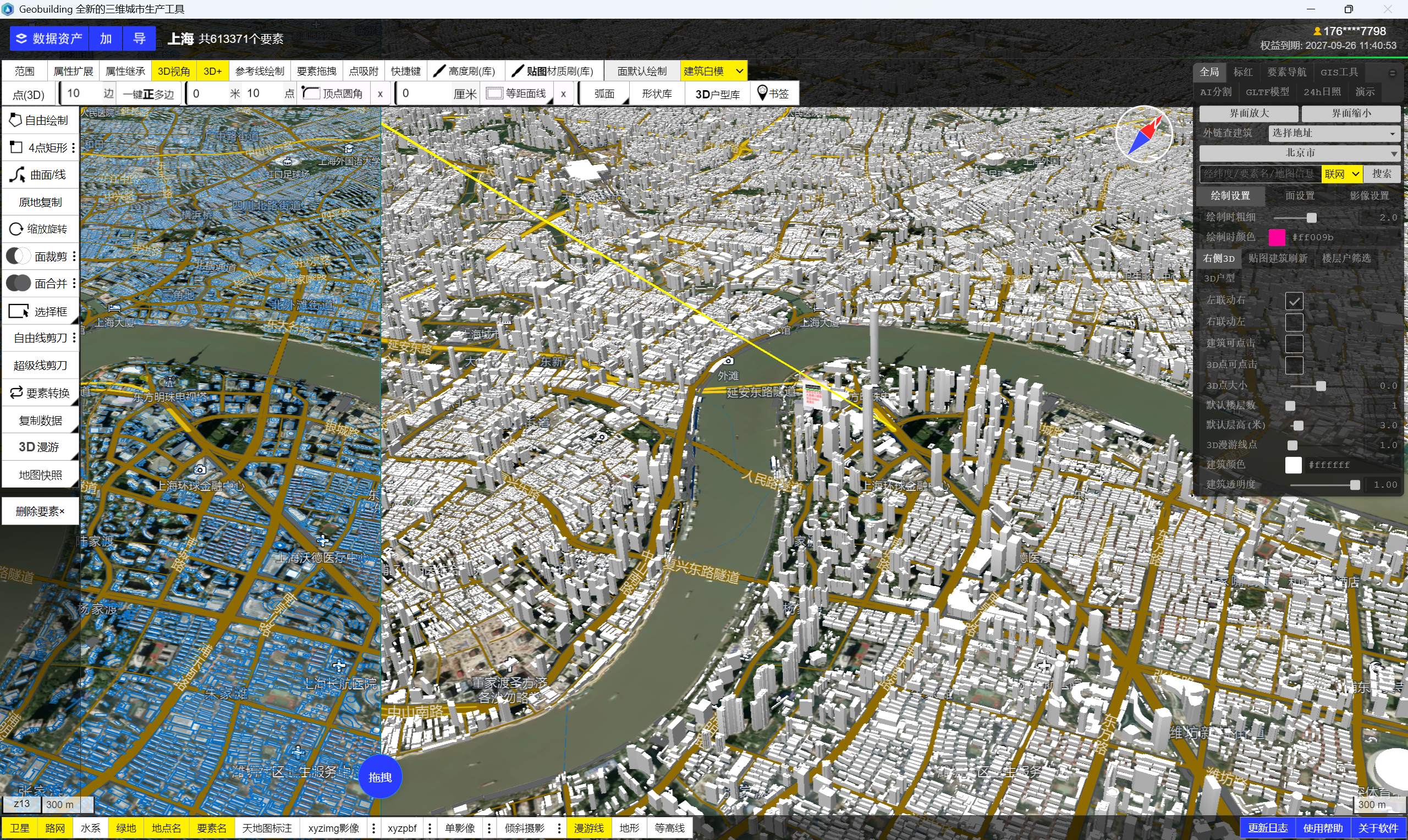 但是这种贴图效果不能很好的表达真实建筑纹理。这种网格mesh也不能很好表达建筑属性,比如屋顶属性。因为shp直接转换3dtiles并没有屋顶结构。现在面临的问题,客户要求 1、没有无人机倾斜摄影数据,直接基于白模贴图 2、能部分独立贴图,部分批量贴图,贴图要能反应建筑纹理。 3、实现L3级别的mesh结构,包含屋顶结构。 4、能导出3dtiles格式,和地理对齐 5、能在3dtiles中拾取任意楼栋 buffer被拉满了。我们来尝试解决。 下图是上海市60w+建筑数据