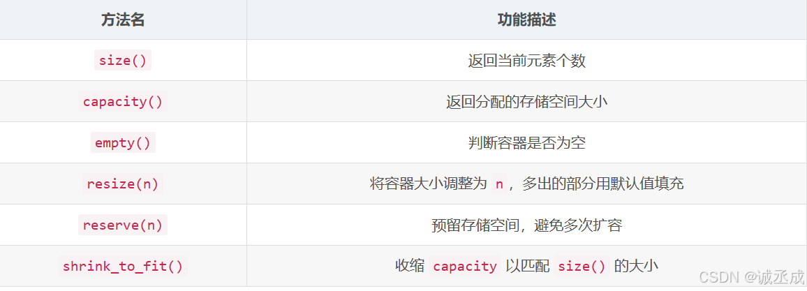 }输出: Size: 5 Capacity: 5//说明还没扩容 After resize: 10 Capacity after reserve: 20 Capacity after shrink_to_fit: 10