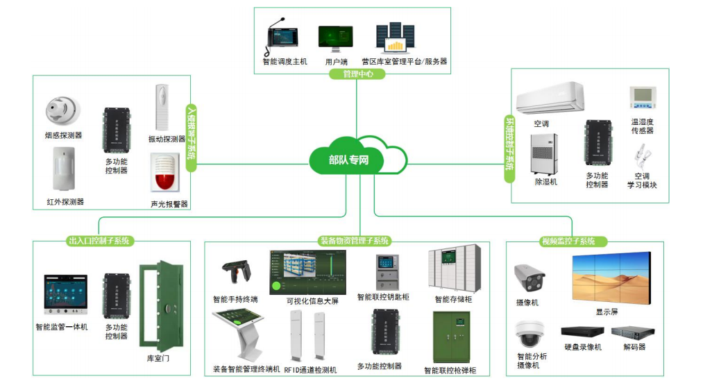 系统通过五大核心子系统的协同运作,实现库室 “安全、环境、资产、人员” 的全维度管控: