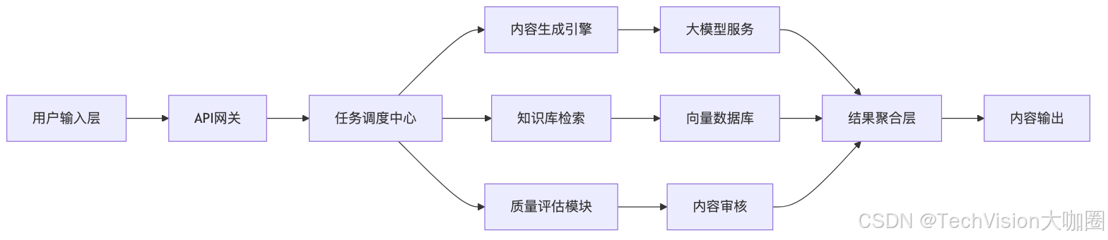 一个完整的AI写作系统需要处理从需求输入到内容输出的全流程。我们采用微服务架构,将系统拆分成多个独立服务,既保证了灵活性,又便于后续扩展。