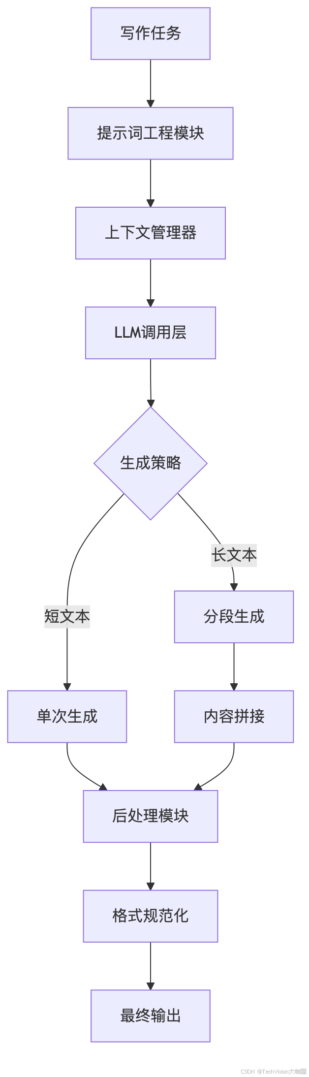 任务调度中心是系统的大脑,根据写作任务的类型和复杂度,动态分配计算资源并编排执行流程。对于简单的短文本生成,可能只需要调用一次大模型;而对于长文写作,则需要拆解成多个子任务,按照“大纲生成-分段写作-内容整合”的流程执行。