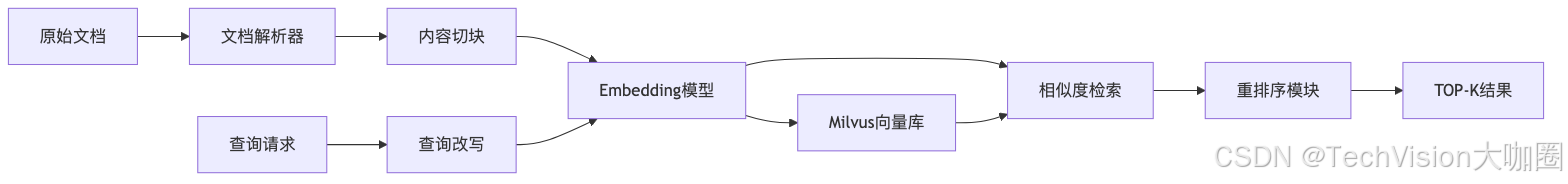 Embedding模型我们选用了m3e-large或bge-large-zh等中文优化模型。这些模型在中文语义理解上表现优异,能够准确捕捉文本的深层语义。向量数据库采用Milvus,它专为海量向量检索设计,支持亿级规模的向量存储和毫秒级查询。
