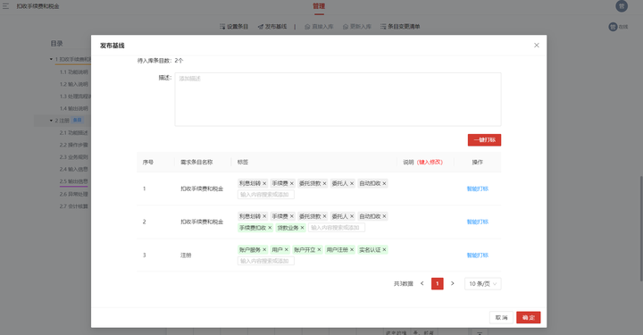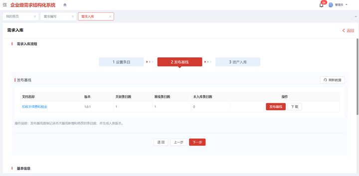 为入库需求发布版本基线,记录需求的当前状态与版本信息(如需求编号、版本号、落地时间、关联项目)。基线发布后,需求内容将被锁定,若需修改需走变更流程,确保需求资产的版本一致性与可追溯性,避免因版本混乱导致的复用误差。