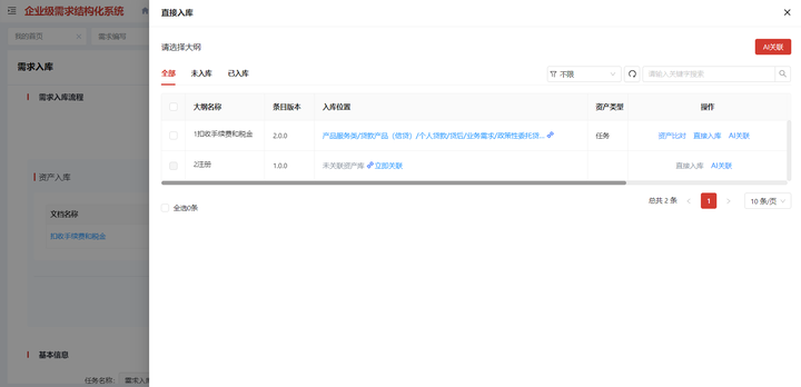 将结构化条目关联至平台的资产结构位置(如按 “业务领域 - 产品模块 - 功能类型” 分类),完成入库。入库后的需求资产可通过关键词检索、分类筛选等方式快速查找,后续项目需类似需求时,可直接调用资产并根据实际场景调整,大幅减少重复开发成本,实现需求资产的循环利用。