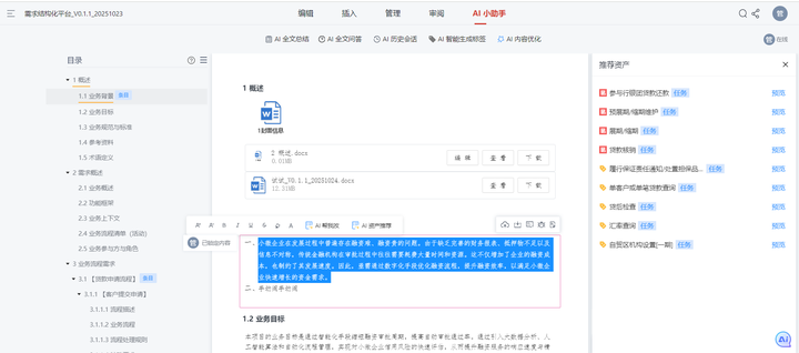 Visual RM 平台的核心工作,是通过 “线上化协同、结构化拆解、资产化沉淀、智能化赋能” 四大能力,构建覆盖需求从创建到入库的全流程管理体系。它打破传统需求管理中 “文档零散、协同低效、资产沉睡” 的痛点,将需求转化为可管控、可复用、可追溯的数字化资产,同时通过 AI 技术提升需求处理效率与质量,实现需求价值最大化。