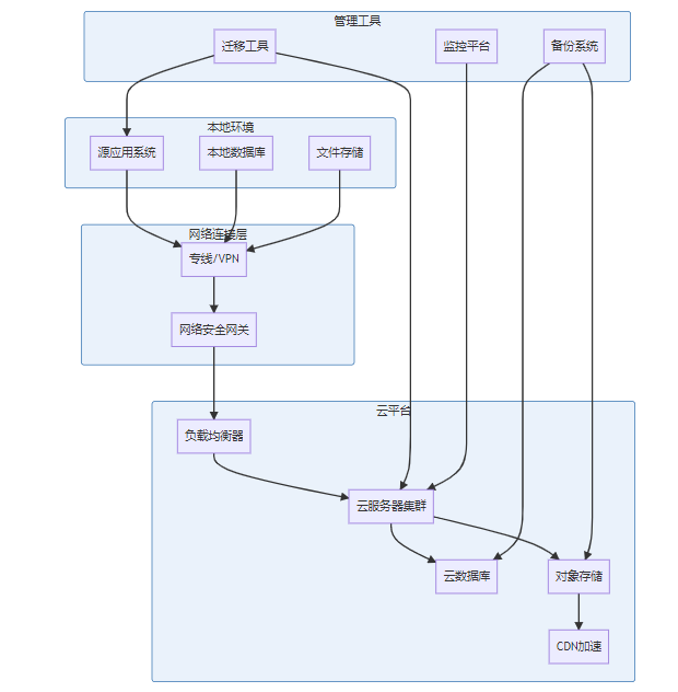 一个完整的云迁移架构就像是一座桥梁,连接着传统IT环境和云平台。让我们看看这座桥是如何构建的:
