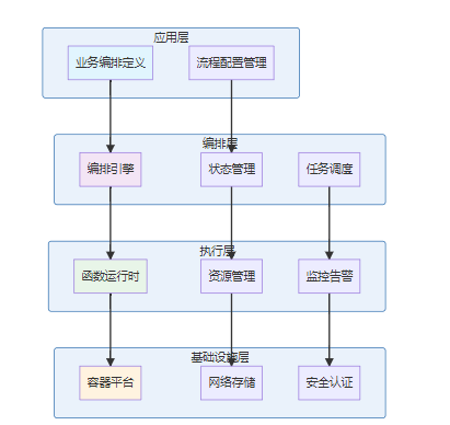 这个分层架构图展示了云函数编排系统的完整技术栈。从上到下分别是应用层、编排层、执行层和基础设施层。每一层都有明确的职责分工,这种设计既保证了系统的模块化,也便于后续的维护和扩展。