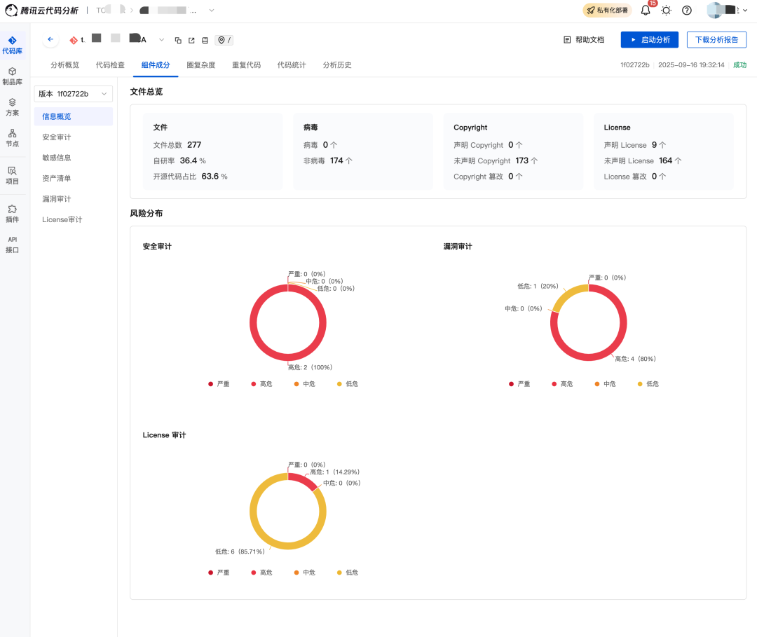 源码/制品组件成分分析主要是分析项目中的软件成分、License合规风险、安全漏洞、开源组件投毒风险,以及敏感信息泄漏等多维度风险。
