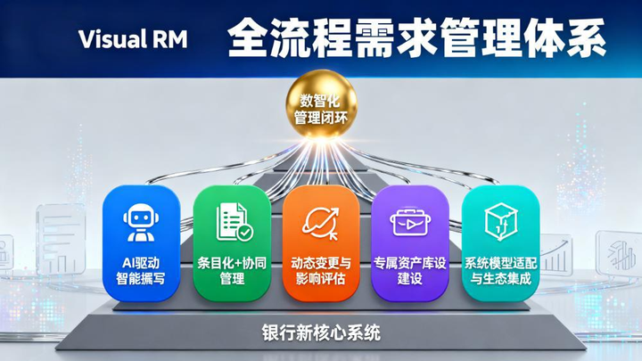 针对银行新核心系统业务需求管理痛点,Visual RM 以 “AI 赋能、精细管控、资产沉淀、生态集成” 为核心,打造覆盖需求全生命周期的数智化管理体系,为新核心系统建设保驾护航。