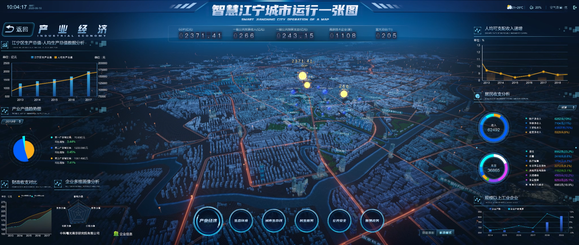 运用三维GIS地理信息系统从基础环境模块、基础设施专题、城市交通专题、公共安全专题、生态环境专题、产业经济专题、民情指数专题、智慧医疗专题等八个方面展示江宁区城市信息,并对江宁区100平方公里进行倾斜摄影、三维建模及可视化展示。