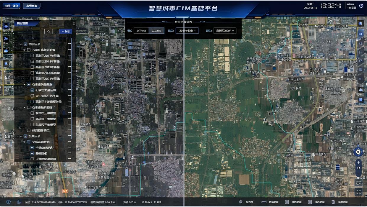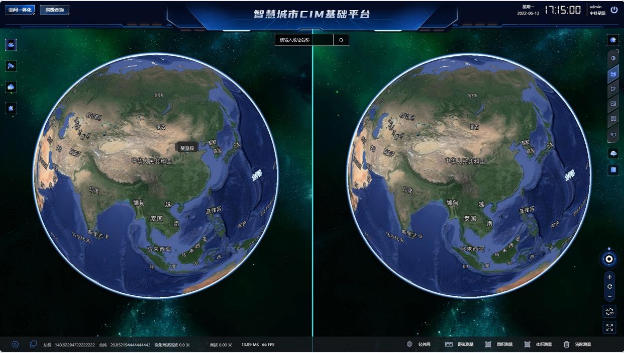 通过数字地球将基础影像、时序影像、矢量地图、DEM、DSM、多级地名、栅格地图、POI等地理信息数据和业务数据等可视化,支持切换和设定不同坐标和投影系统,支持左右分屏、上下分屏,并通过拖拽分屏线设置屏的宽度,同时提供鸟图、经纬度信息、指北针、量测分析、比例尺、经纬网、格网、帧率计算等基础地球操控插件。