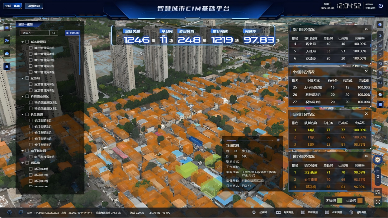 赋能城市拆迁建设,同步拆迁数据,实时展示拆迁进度状况、各部门任务及完成情况,帮助政府决策者研判分析、指挥拆迁。同时对接入视频实现自动投影、校准等摄像测量学算法和多视频衔接的融合,全方位保障政府拆迁工作。