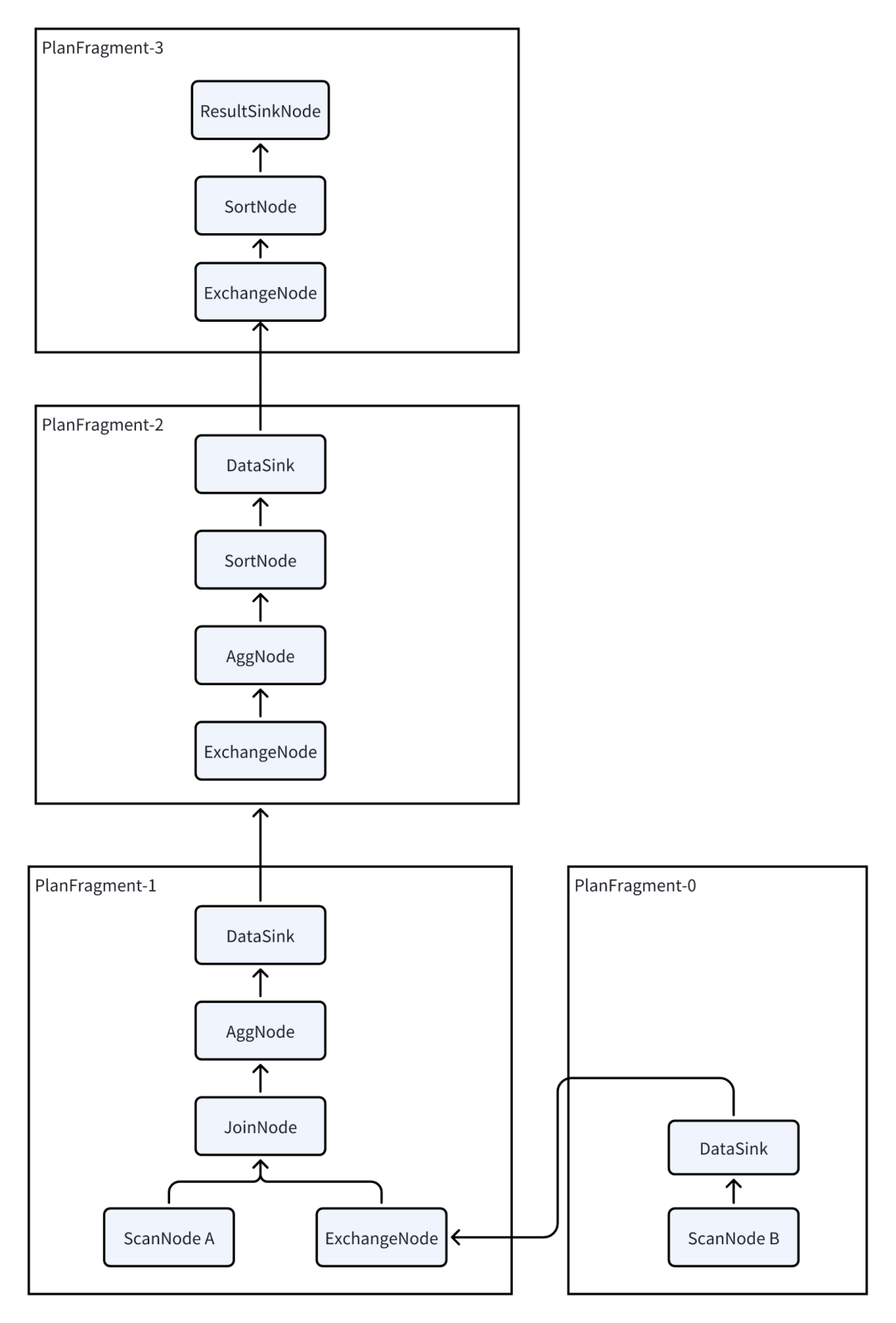 当 FE(Frontend)把 SQL 转为 PLAN 并插入 Exchange / DataSink 等节点后,会把 PLAN 切分为若干个 FRAGMENT,分发到各个 BE。BE 收到 Fragment 后,继续把 Fragment 拆成 Pipeline 并实例化为具体任务执行。