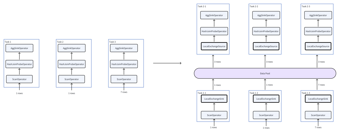 在分布式执行中,数据倾斜会导致某些 Task 处理大量数据,从而拖慢整体查询。Doris 引入 Local Exchange 在本机做局部重分发: