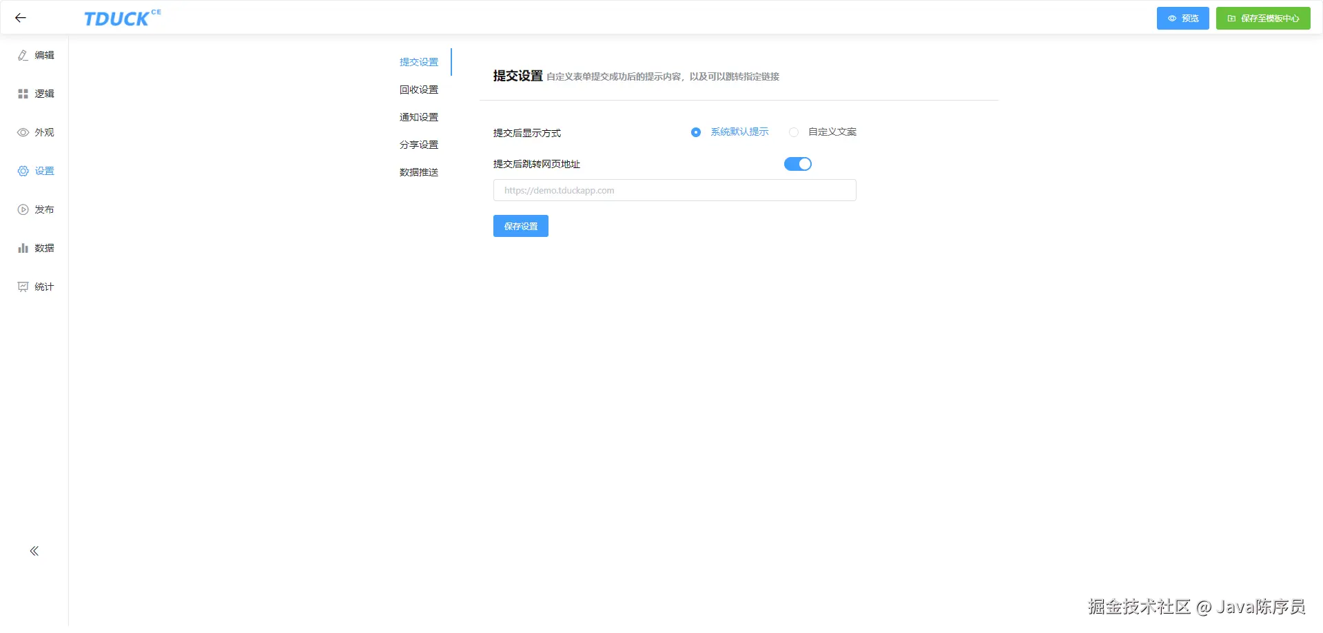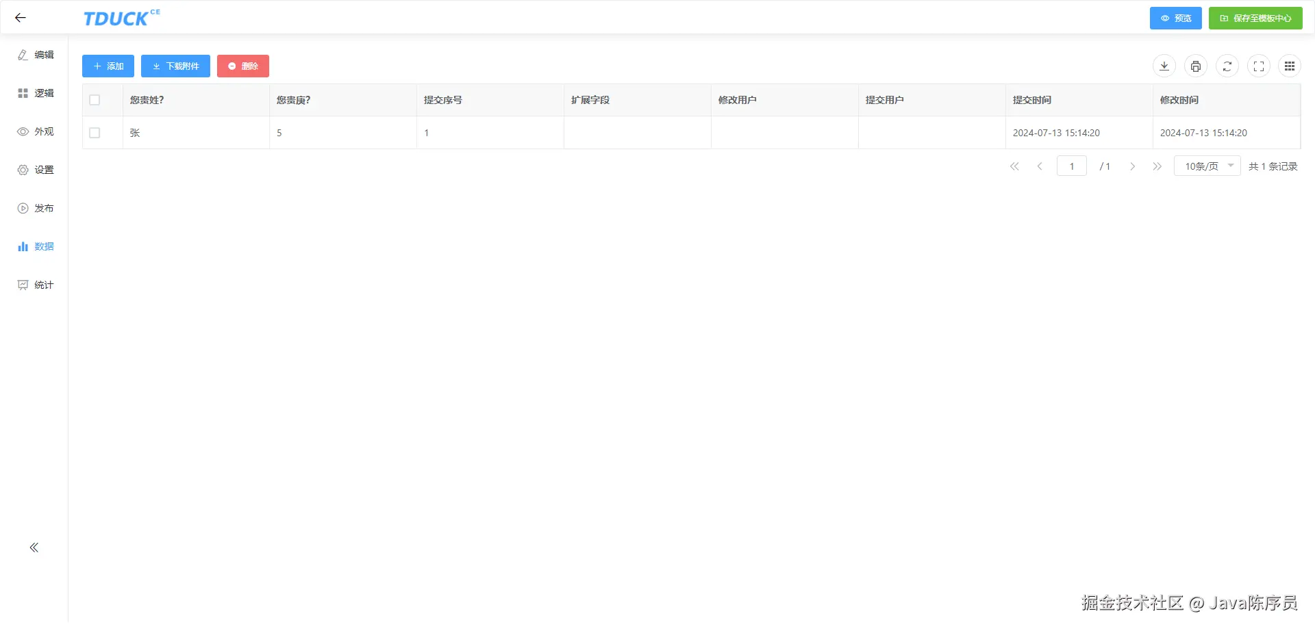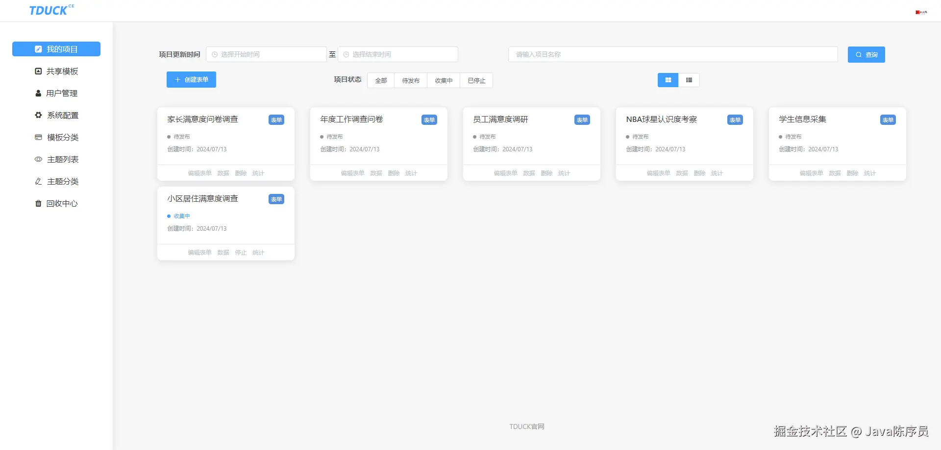 TDuck —— 一款免费的表单问卷系统,支持快速创建问卷或业务表单,采用无代码理念支持开发自定义组件。采用 SpringBoot + Vue + ElementUI 技术栈,功能强大界面清新,支持一键部署。