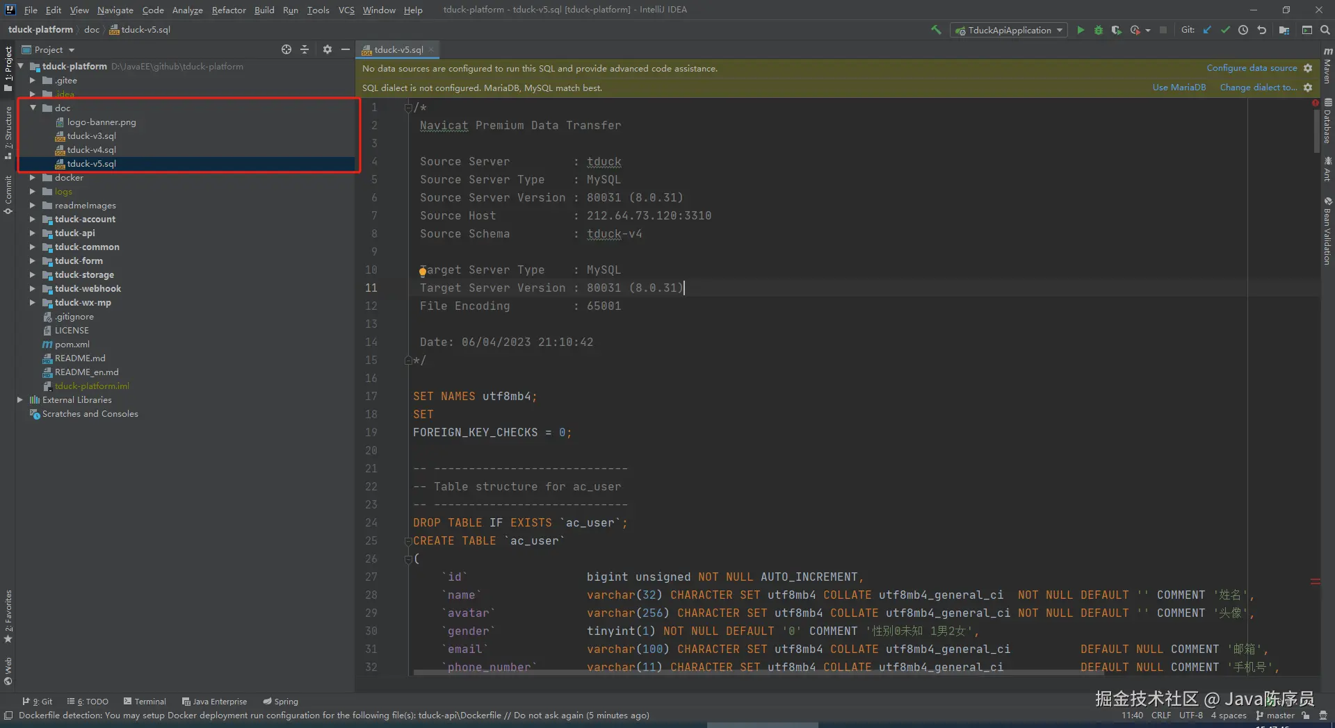 sql 体验AI代码助手 代码解读复制代码CREATE DATABASE tduck DEFAULT CHARACTER SET utf8mb4 COLLATE utf8mb4_bin;5、执行项目目录下 doc/tduck.sql 文件