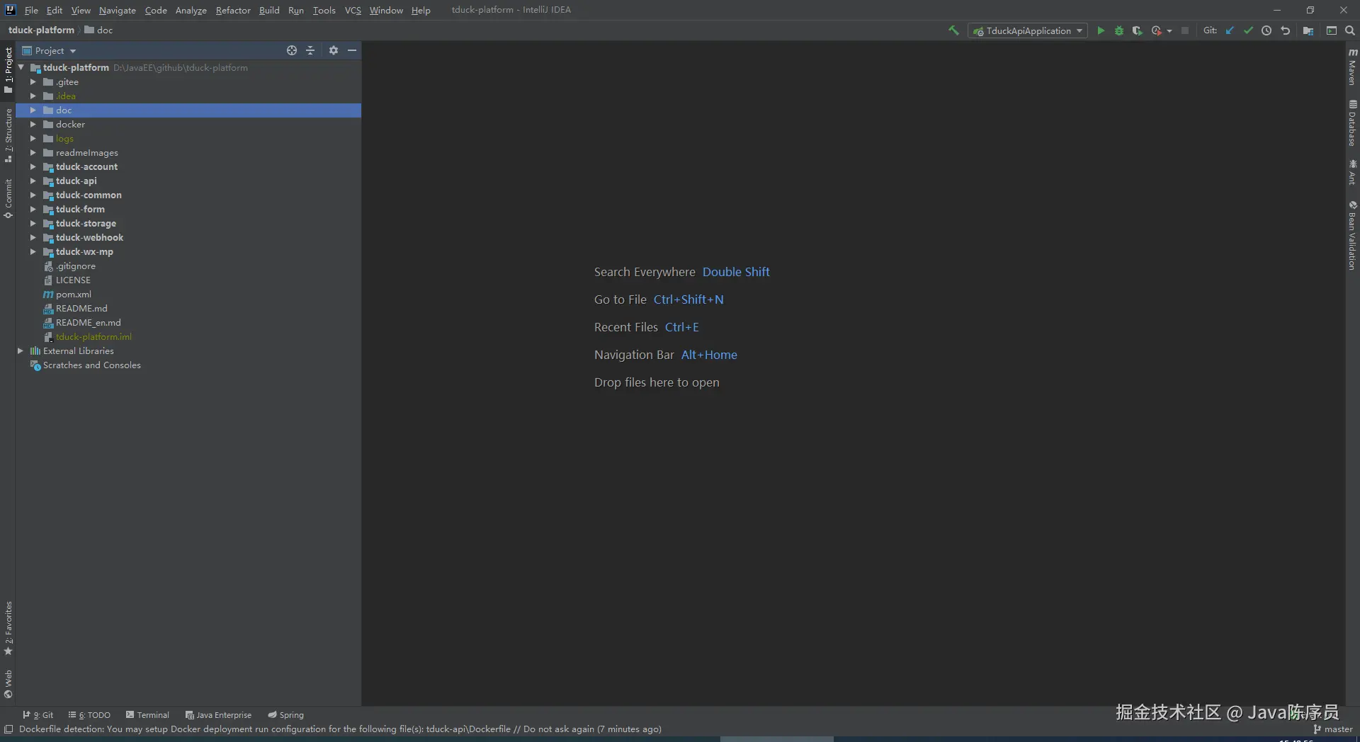 bash 体验AI代码助手 代码解读复制代码git clone https://gitee.com/TDuckApp/tduck-platform.git2、将项目以 Maven 的形式导入到 IDEA 中