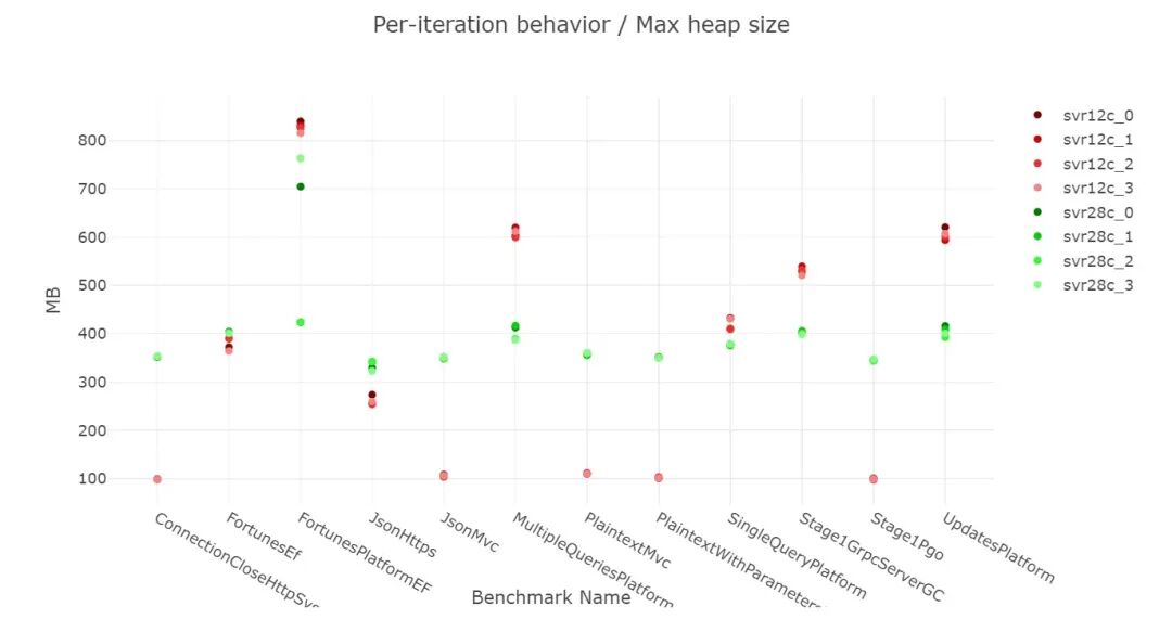 如果我们看 asp.net 基准测试的“最大堆大小”指标,可以明显看到 Server GC 在 28 核机器(28c)和 12 核机器(12c)上的行为差异——