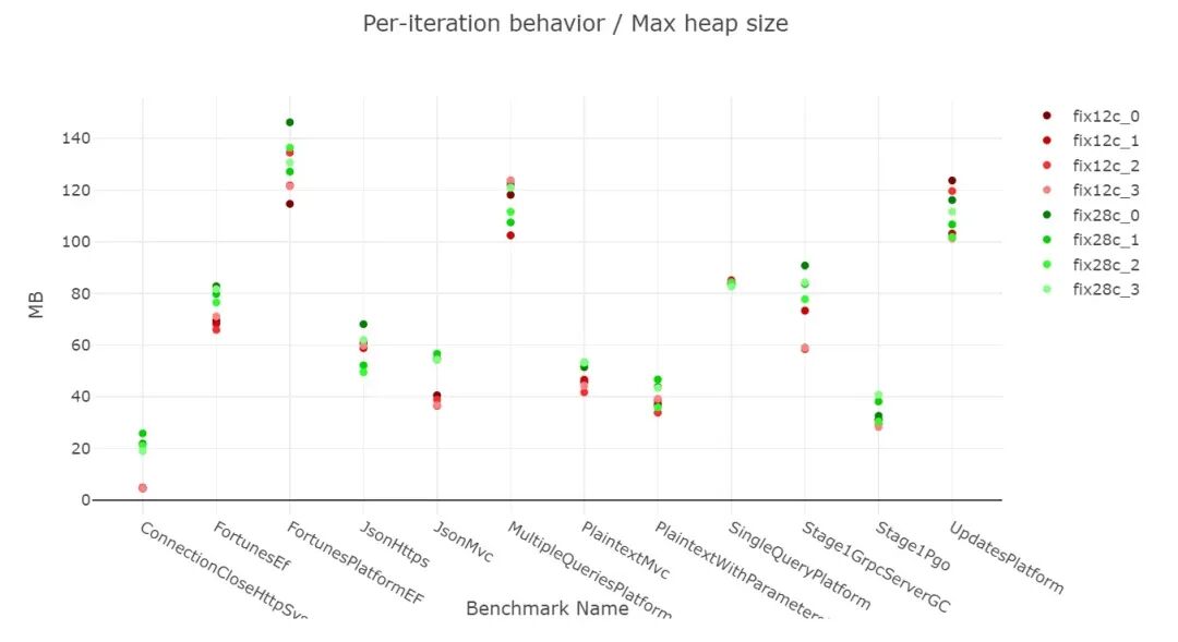 细心的读者会注意到图中的颜色顺序并不一致。比如在 MultipleQueriesPlatform 场景中,最大堆大小在 12c 情况下比 28c 更大。仔细查看数据可以发现,在 12c 情况下最大堆大小其实发生在测试一开始——
