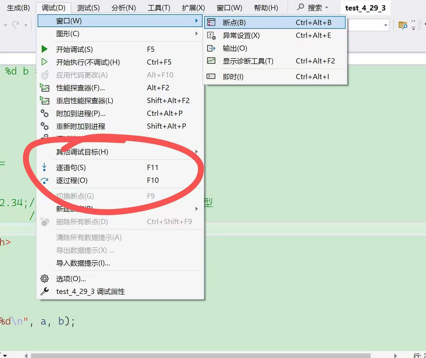 光标移动到调试(D)这,在图中用红笔标注的地方我们可以看到逐过程(O)和逐语句(S),这个F10是不是很熟悉?F10就是逐过程的快捷键,我们想要实现VS的监视功能就需要用到它。F11逐语句就是用来进到函数里面来的,所以想进函数里面是用F11,本文我主要给友友们介绍监视是怎么实现的,所以先提一嘴。这里挖一个小坑——在之后我会专门更新关于VS2022实用调试技巧的文章,嘿嘿。