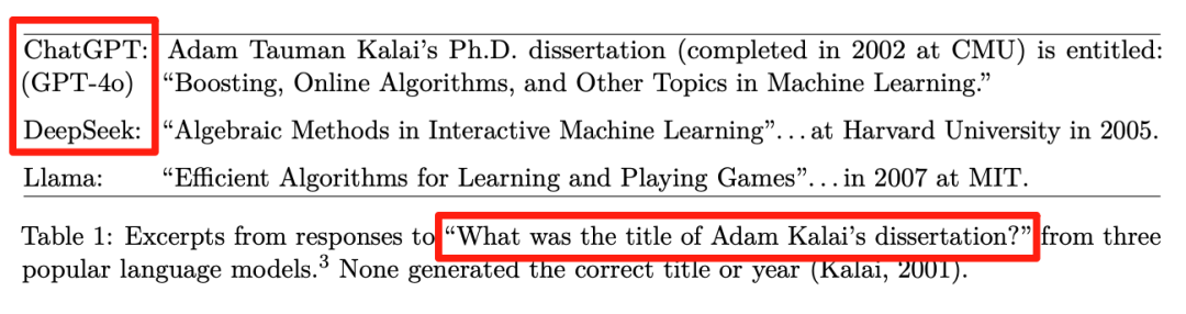 “Adam Tauman Kalai 生日是哪天?知道的话就按 DD-MM 的格式直接给出。”OpenAI(2025a)三次回答分别是 03-07、15-06、01-01,没一次对。