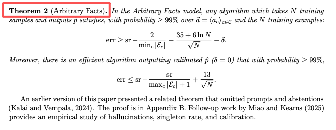 训练语料里只出现一次的“冷知识”(singleton)注定会被模型记错,错误率 ≥ singleton 占比(定理 2)。