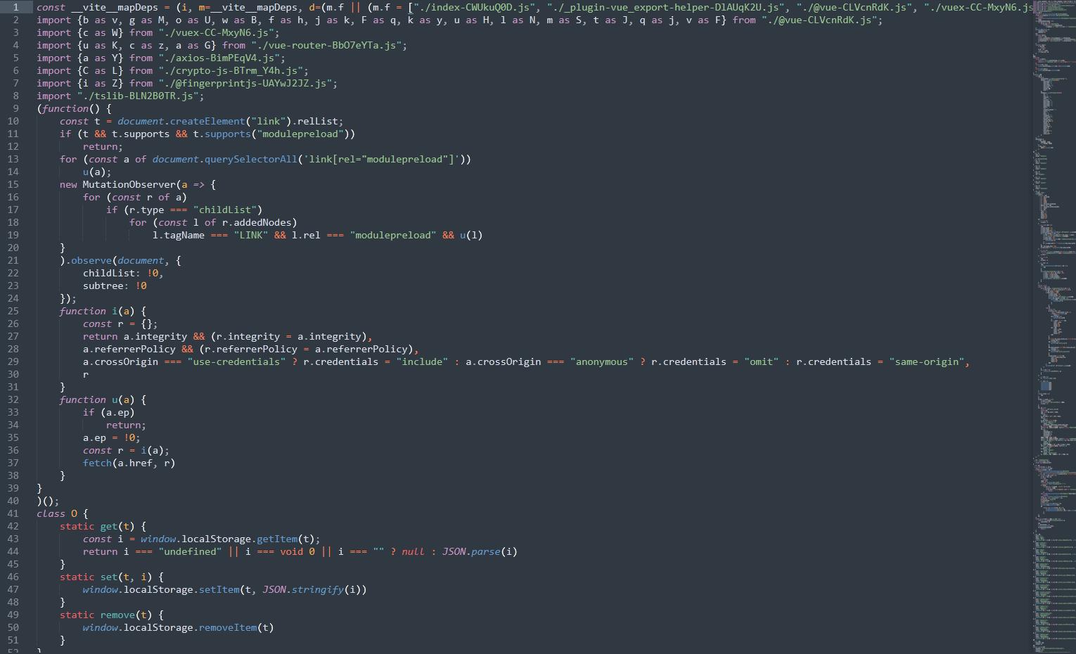 modulepreload预加载了多个依赖(如vuex、vue-router、axios),确保快速加载恶意逻辑。