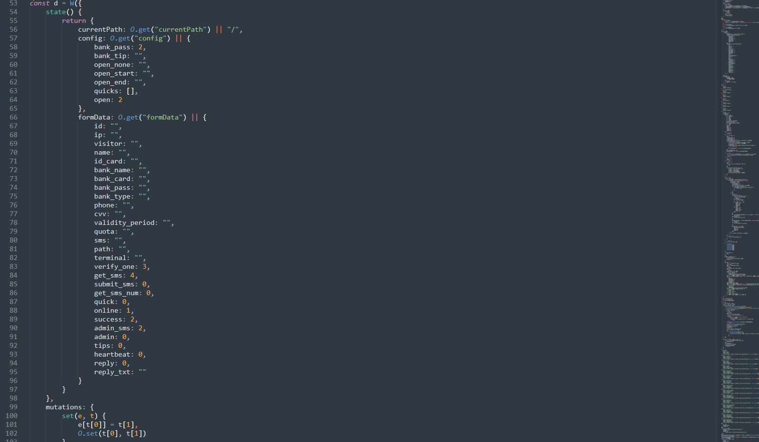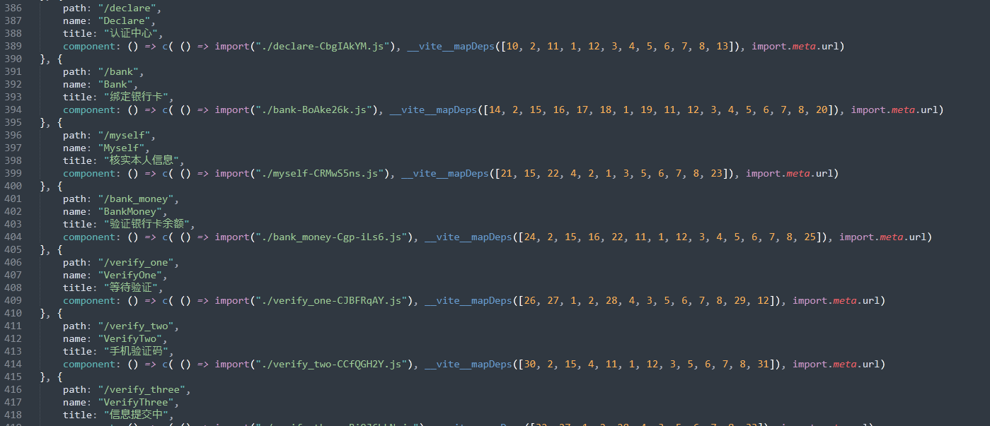页面基于Vue.js构建,使用`Vue Router`管理路由(如/bank、/verify_one),Vuex进行状态管理,Axios发送HTTP请求,Crypto-JS用于数据加密。这些技术组合实现了复杂的用户交互和数据窃取功能。