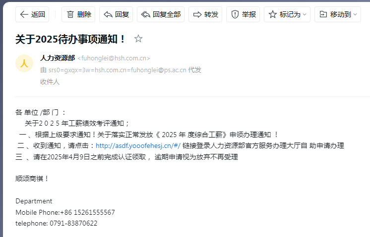 邮件伪装成“2025年工薪绩效考评通知”,利用“官方通知”的权威性诱导用户点击链接http://asdf.yooofehesj.cn/#/。该域名与代码中的后端域名apiefefei.cn相似,均为随机生成的低可信域名。
