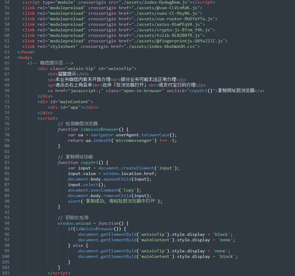 通过navigator.userAgent检测是否在微信内访问。若在微信中,显示提示层(提示“本业务微信内暂未开放办理”),诱导用户**复制链接到外部浏览器**,以绕过微信的安全限制。