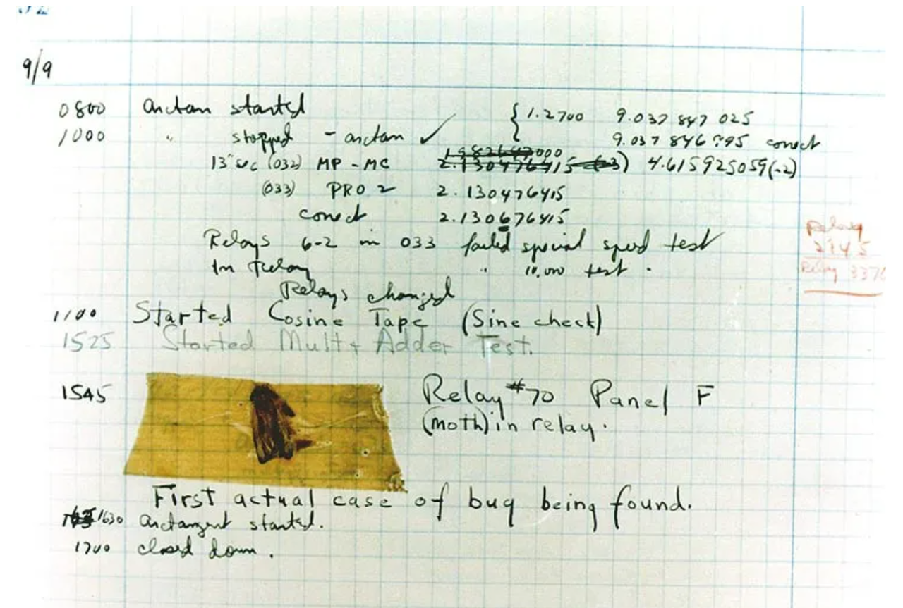 “Bug”的创始人格蕾丝·赫柏(Grace Murray Hopper)在报告中用胶条贴上飞蛾,并把“bug”来表示“一个在电脑程序里的错误”,“Bug”这个说法一直沿用至今。