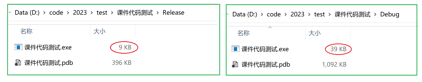 这样一对比就可以看到从同一段代码,编译生成的可执行文件的大小,release版本明显要小,而debug版本明显大不少。这就是因为release版本少了调试(无需包含调试信息),并且程序在代码大小也是最优的,所以release版本的可执行文件大小会明显比debug版本小得多。
