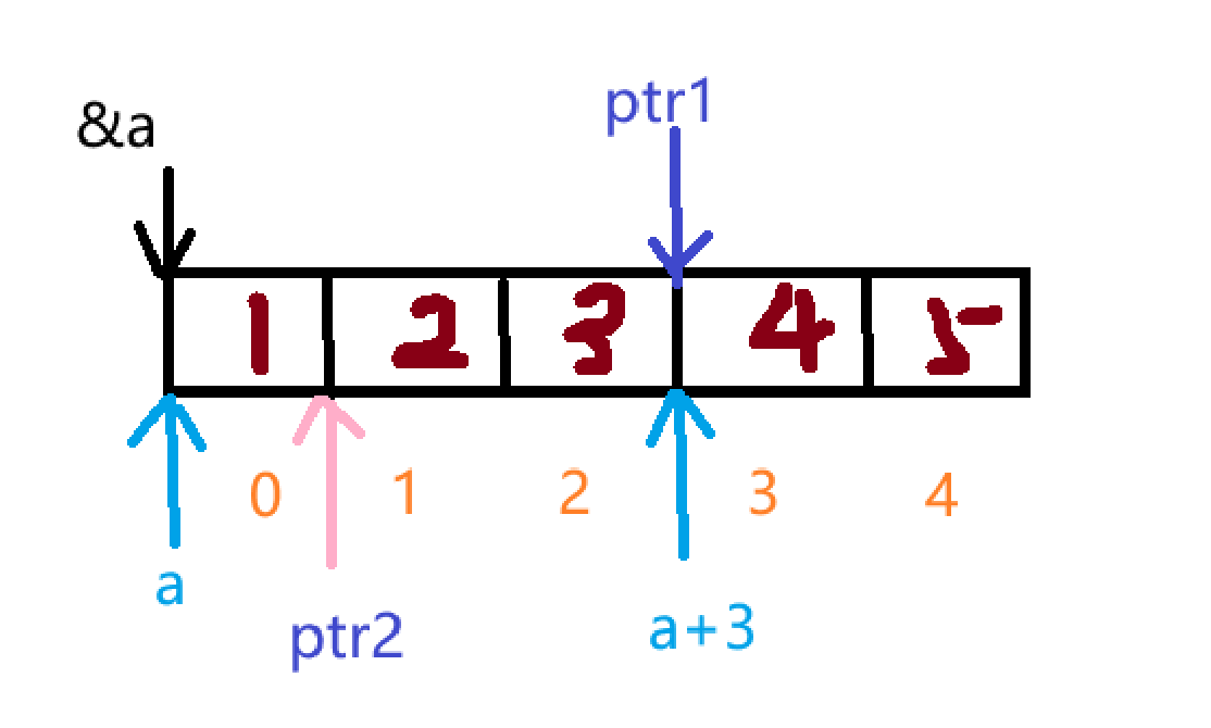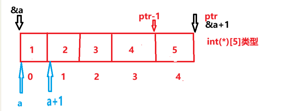 //程序的结果是什么? 解析: 1、这里&a是数组地址,+1跳过一整个数组到图示位置,将这样的地址存放在ptr中,类型不符合,所以将(&a+1)强制类型转换为(int*)类型; 2、a是数组名,在这里是数组首元素地址,a+1是数组第二个元素的地址,则*(a+1)是第二个元素,也就是2; 3、ptr刚开始在图示&a+1处,-1到达图中所示位置,则*(ptr-1)是此地址处的元素,也就是5; 4、因此程序的结果是:2 5