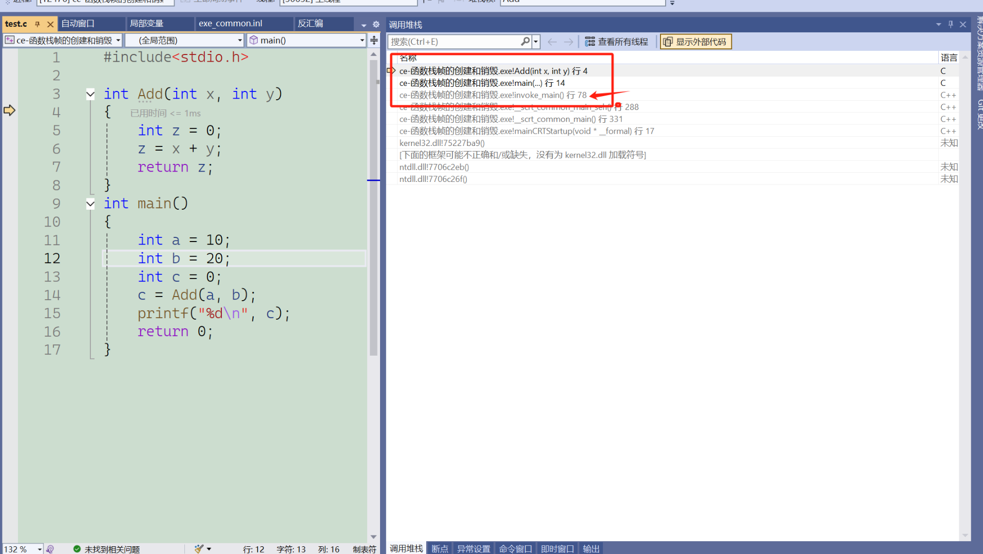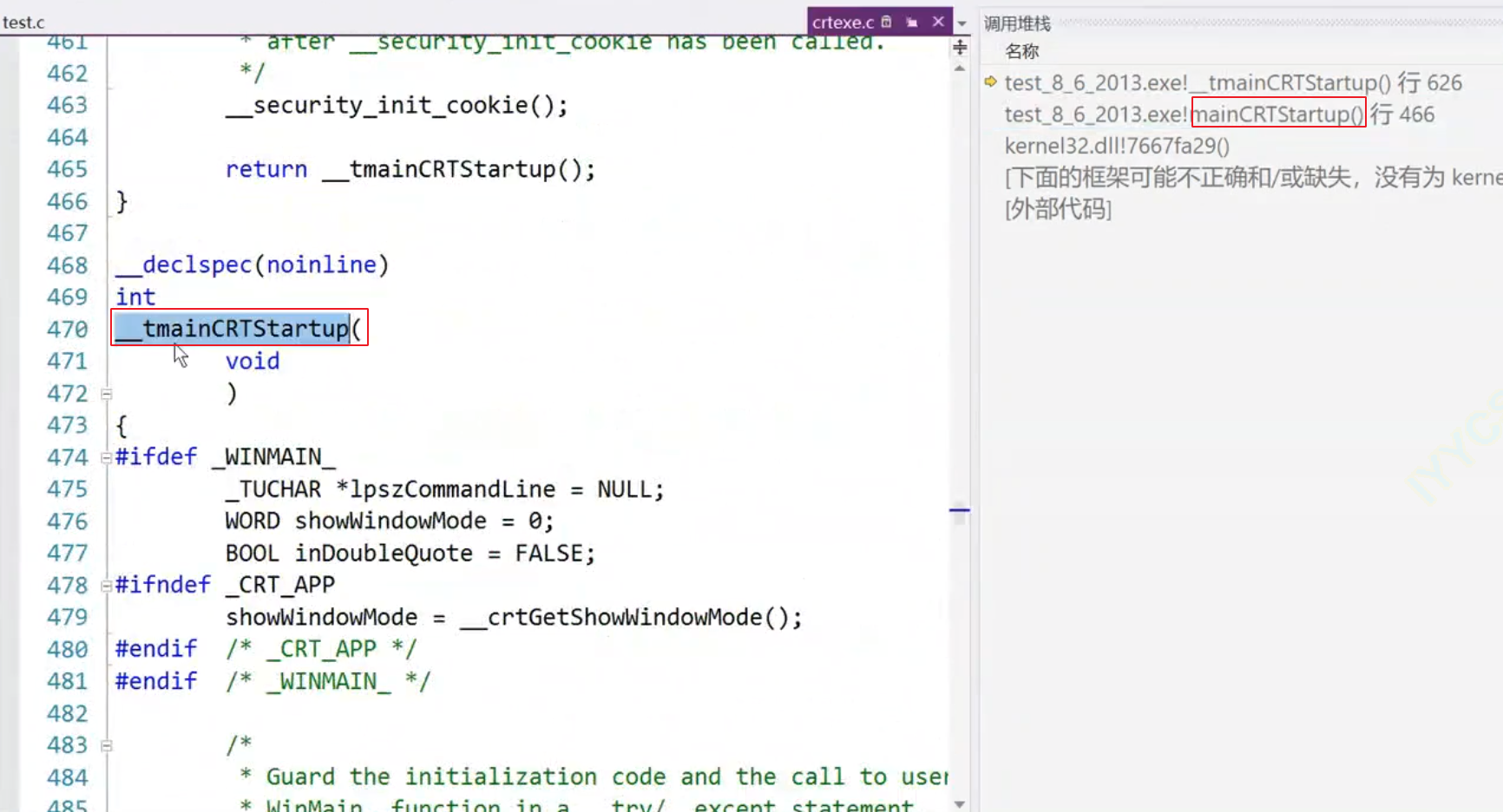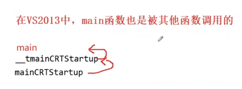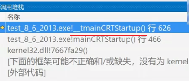 我们在上面的代码中可以观察到Add函数被main函数给调用了,而我们使用【调用堆栈】观察函数时发现main函数起始也被调用了,那我们知道main函数是被谁给调用了吗?这个我们要在VS2013上观察,如果用VS2022版本来调试不容易看出来。