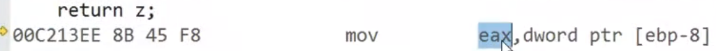 //将ebp-8地址处的值放在eax中,其实就是把z的值存储到eax寄存器中,通过eax寄存器带回计算的结果最后就是函数栈帧的销毁——