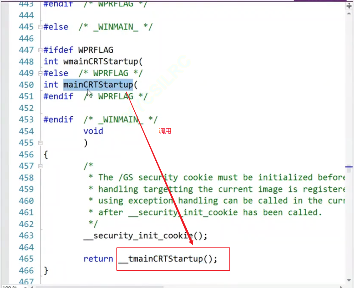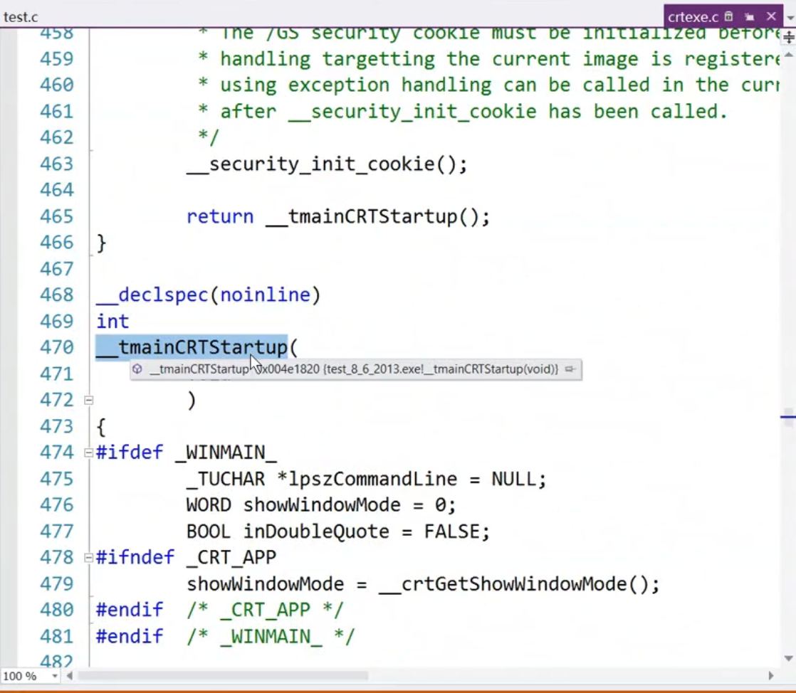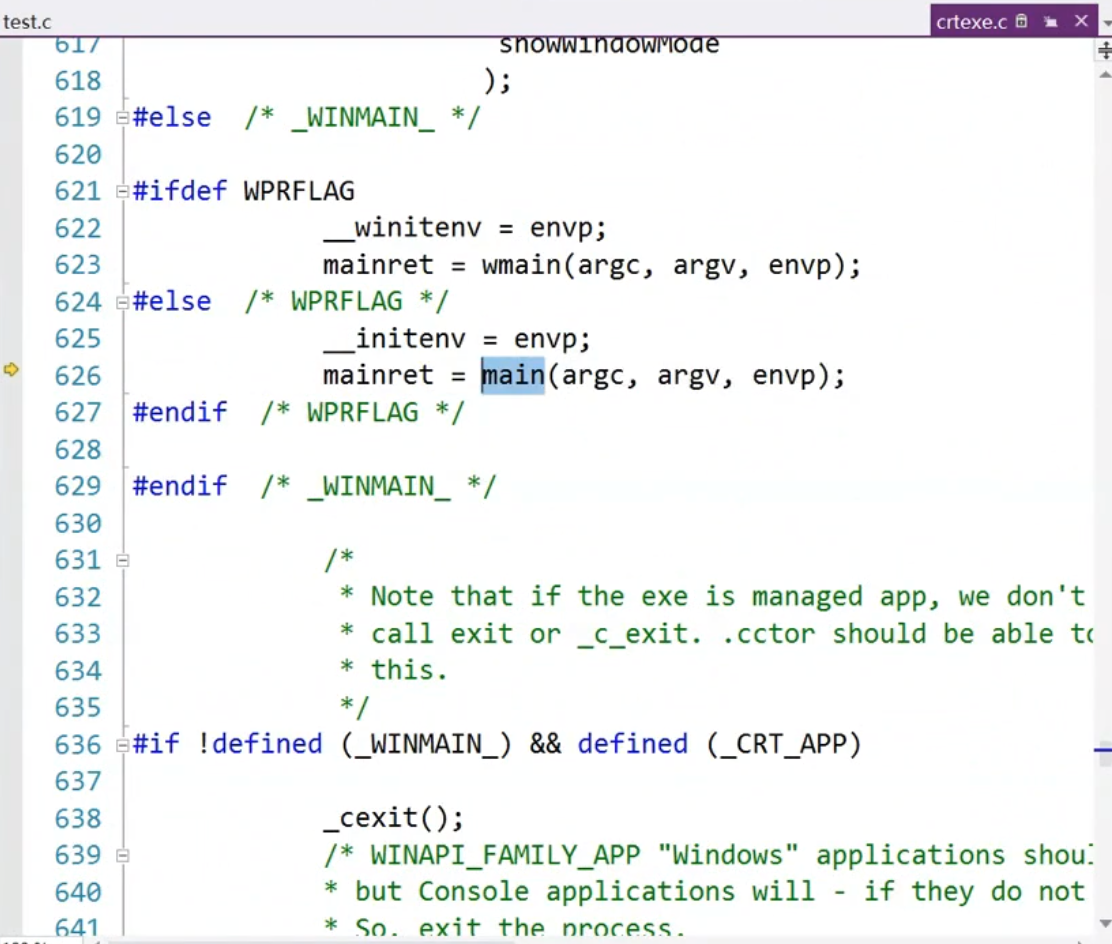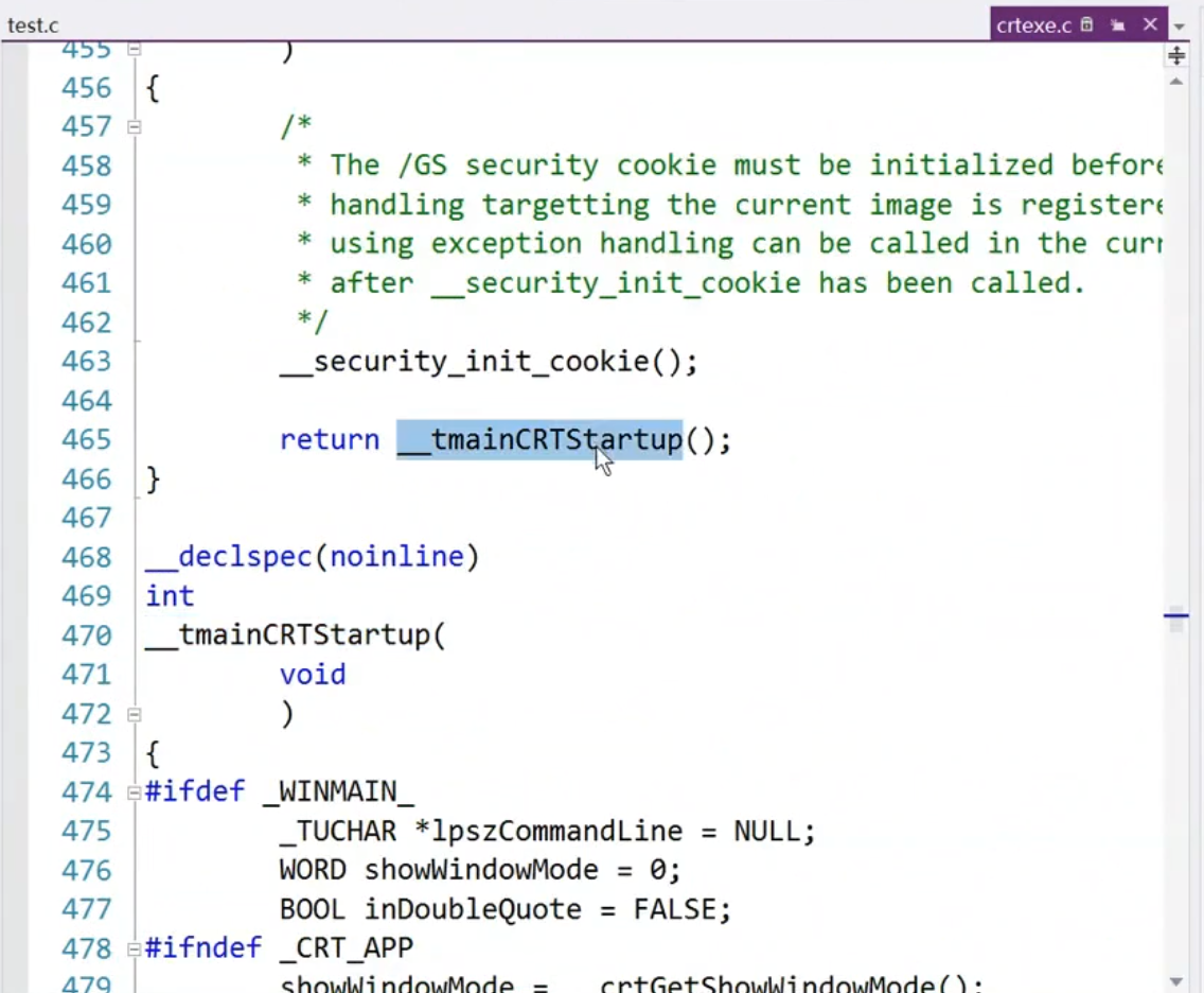 而调用main函数的这个 __tmainCRTStartup()函数实际上也是被别的函数给调用的,就是这个mainCRTStartup(如下图),其实这个调用逻辑还是比较复杂的,但是大家还是要知道有这么一回事: