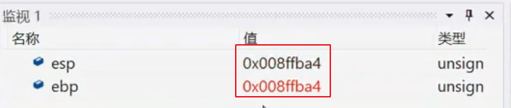 esp维护的是栈顶的指针,所以也要挪上去。看到这儿,我们打开监视,输入这两个寄存器(里面存放了地址),按F10,push完之后·地址会有什么变化哩?